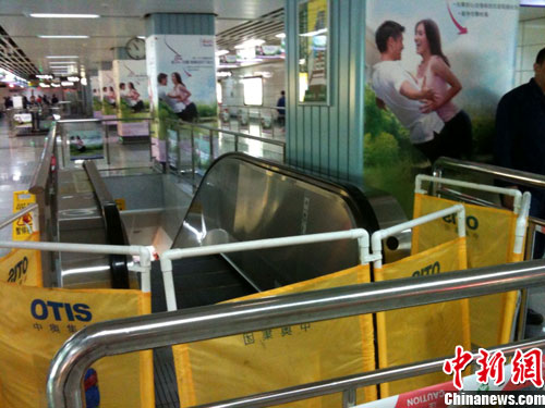地鐵國貿(mào)站是雙站臺,發(fā)生事故的是第一層站臺通往站廳之間的一部OTIS扶手電梯。記者趕到現(xiàn)場時,傷員已經(jīng)被送往醫(yī)院救治,出事電梯被警方封鎖。乘客需走旁邊的樓梯出站。