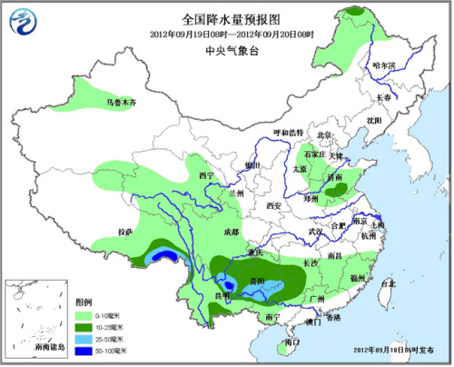 19日08時(shí)至20日08時(shí),新疆沿天山地區(qū)、青藏高原中東部、西南地區(qū)、華南西部、江南西部、華北南部、黃淮大部、內(nèi)蒙古東北部等地有小到中雨或陣雨,其中,西藏東南部、云南東北部、貴州東南部、廣西西北部的部分地區(qū)有大雨,局地暴雨。東海南部海域、臺灣海峽、臺灣以東洋面將有5~6級、陣風(fēng)7級的東北風(fēng)。