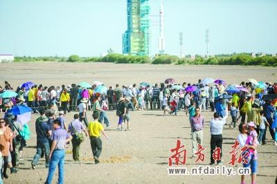①戈壁腹地,藍(lán)天下,發(fā)射塔內(nèi)的神舟十號(hào)飛船和長(zhǎng)征2F遙十火箭組合體揭開其神秘的面紗,航天城的居民、各路記者以及嘉賓游客云集于此,目睹這載入歷史的一刻。