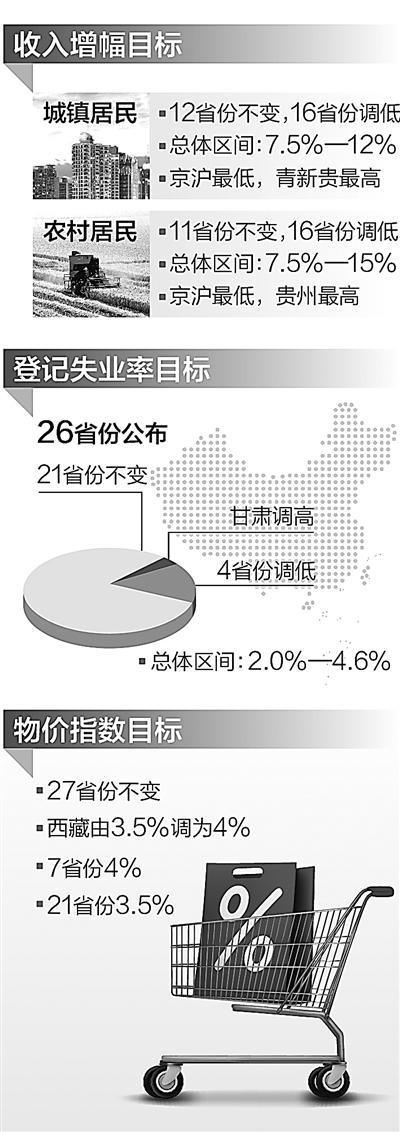 截至1月23日,除了安徽、海南、湖南,全國共有28個省份召開兩會。梳理各地政府工作報告可以發(fā)現(xiàn),緊扣經(jīng)濟增長目標(biāo),各地居民收入、物價指數(shù)、登記失業(yè)率等指標(biāo)也作了相應(yīng)調(diào)整。整體表現(xiàn)為:收入增幅目標(biāo)調(diào)低,物價調(diào)控目標(biāo)保持穩(wěn)定,登記失業(yè)率目標(biāo)變化不大。