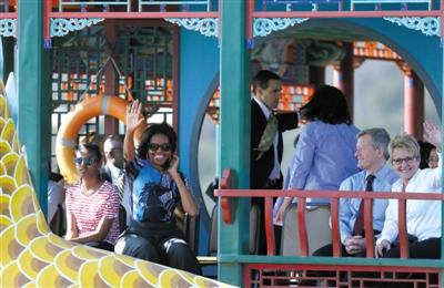 不過,米歇爾昨日并未去游覽佛香閣,而是乘船游覽昆明湖。陪同她游覽的還有美國大使夫婦。在船上,身著藍(lán)色上裝、黑色褲子的米歇爾面帶笑容,不時向岸邊圍觀的游客揮手致意。