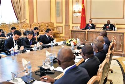 5月9日,國務(wù)院總理李克強(qiáng)在安哥拉總統(tǒng)府同安總統(tǒng)多斯桑托斯舉行會談,外交部部長王毅、國家發(fā)改委主任徐紹史、商務(wù)部部長高虎城等參加。新華社發(fā)