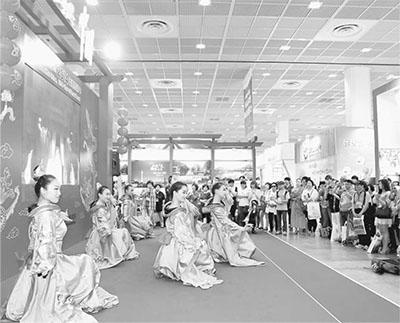 中韓兩國一衣帶水,文化交往源遠(yuǎn)流長。圖為不久前在首爾舉行的第二十九屆韓國國際旅游展上,韓國參觀者觀看中國展臺(tái)的舞蹈表演。