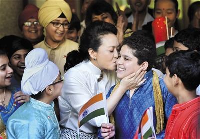 9月18日,印度新德里,彭麗媛訪問(wèn)泰戈?duì)枌W(xué)校,與兒童親密互動(dòng)。