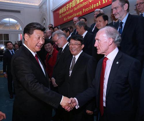 習近平指出,近年來,孔子學院在英國快速發(fā)展。目前,英國已經建立起29所孔子學院和126個孔子課堂,數量居歐洲之首。全英孔子學院取得的碩果也是中英人文交流蓬勃發(fā)展的縮影。通過人文交流,中英兩國文化中的精華正在對兩國人民的思維方式和生活方式產生著奇妙的“化學反應”。“為之不厭,誨人不倦。”希望在座各位教師再接再厲,為中英友好事業(yè)添磚加瓦。希望孔子學院繼續(xù)秉承“相互尊重、友好協商、平等互利”的校訓,為傳播文化、溝通心靈、促進世界文明多樣性作出新的更大貢獻。