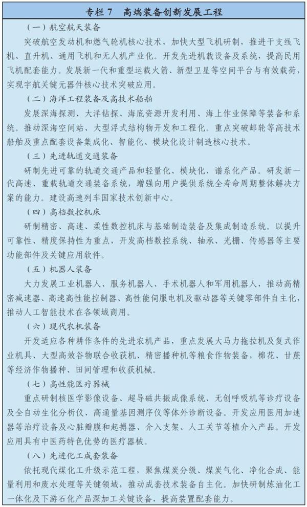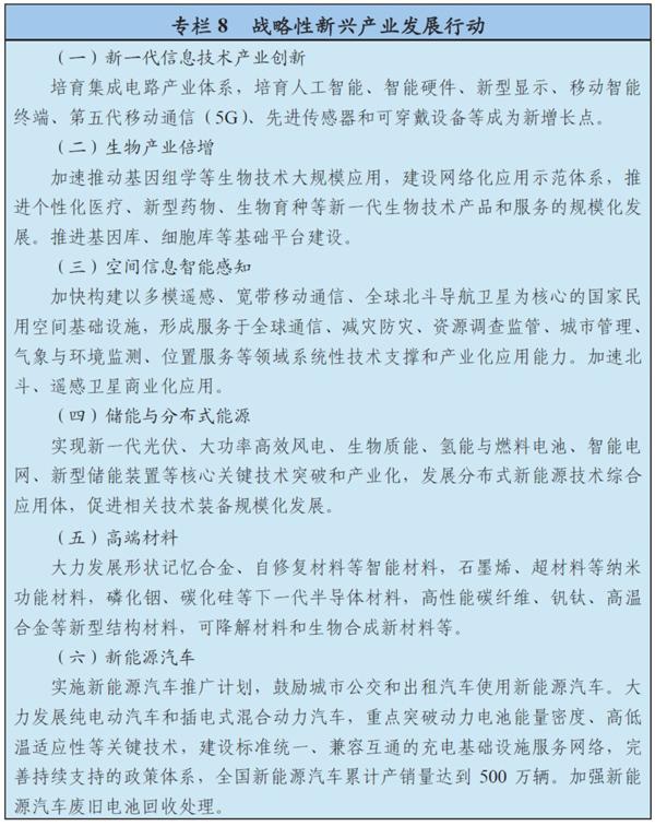 支持新一代信息技術、新能源汽車、生物技術、綠色低碳、高端裝備與材料、數字創(chuàng)意等領域的產業(yè)發(fā)展壯大。大力推進先進半導體、機器人、增材制造、智能系統、新一代航空裝備、空間技術綜合服務系統、智能交通、精準醫(yī)療、高效儲能與分布式能源系統、智能材料、高效節(jié)能環(huán)保、虛擬現實與互動影視等新興前沿領域創(chuàng)新和產業(yè)化,形成一批新增長點。