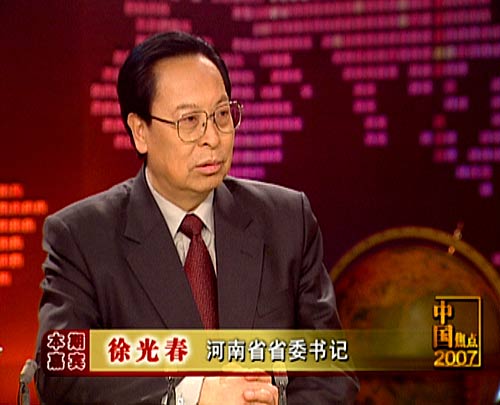 好,接下來(lái)我們繼續(xù)來(lái)關(guān)注新農(nóng)村建設(shè)的話題。今天在演播室我們非常容幸地邀請(qǐng)到中共河南省委書記徐光春先生。您好,徐書記。