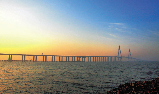 呈“S”形的杭州灣跨海大橋全長三十六公里,海上段長度三十二公里,北起浙江嘉興市海鹽鄭家埭,跨越喇叭口狀的杭州灣后,止于浙江寧波市慈溪水路灣。
