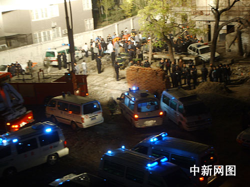 北京千龍網(wǎng)4日凌晨1時(shí)28分刊發(fā)的報(bào)道說(shuō),11月3日21時(shí)14分,北京市公安局接報(bào):宣武區(qū)南橫街東口一施工預(yù)留工地民工臨時(shí)宿舍發(fā)生坍塌。接報(bào)后,市有關(guān)領(lǐng)導(dǎo)以及適應(yīng)急辦、市公安局、市安監(jiān)局、市建委、市衛(wèi)生局和宣武區(qū)有關(guān)負(fù)責(zé)同志及時(shí)趕赴現(xiàn)場(chǎng)組織救援,并到醫(yī)院看望傷員。