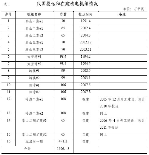 截至目前,我國核電站的安全、運行業(yè)績良好,運行水平不斷提高,運行特征主要參數(shù)好于世界均值;核電機(jī)組放射性廢物產(chǎn)生量逐年下降,放射性氣體和液體廢物排放量遠(yuǎn)低于國家標(biāo)準(zhǔn)許可限值。秦山一期核電站已安全運行14年,最近一個燃料循環(huán)周期還創(chuàng)造了連續(xù)安全運行400天的新記錄。大亞灣核電站近年的運行水平與核能發(fā)達(dá)國家的水平相當(dāng),運行業(yè)績進(jìn)入了世界先進(jìn)行列。我國投運和在建核電項目情況見表1。