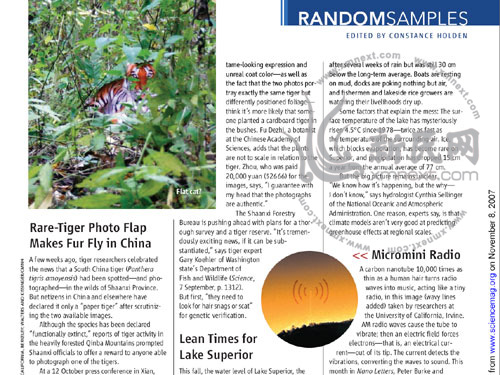 11月8日13時,新民網聯(lián)系位于美國的《科學》雜志總部詢問刊登華南虎照的真實動機,但因時差關系至新民網截稿時,《科學》尚未對此問題作出官方回復。11月9日,新民網在業(yè)內人士的幫助下,第一時間在《科學》官網上獲取到本期雜志的電子版。在Constance Holden(康斯坦斯·霍盾)編輯的“Randomsamples”(隨機樣本)欄目中,第一篇新聞報道刊出了周正龍的照片。