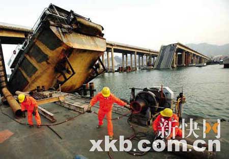 記者昨天來到肇事沉船旁的施工現(xiàn)場,看到負(fù)責(zé)沉船打撈工作的施工隊已經(jīng)開始施工,固定船體的鋼管樁正在緊張施工中。負(fù)責(zé)九江大橋修復(fù)工作的項目部總經(jīng)理毛志堅告訴記者,省交通廳兩次會同廣東海事局在廣州召開九江大橋肇事沉船打撈方案及工作協(xié)調(diào)會,決定采用先穩(wěn)定沉船、再切割、然后打撈的方案。也就是說,在船尾翹起的部分支一個龍門架,然后將船尾吊起,再用水下切割的辦法將被橋梁壓住的船頭與船尾割斷。船尾部分直接拖走,船頭留待清理河床時再清走。
