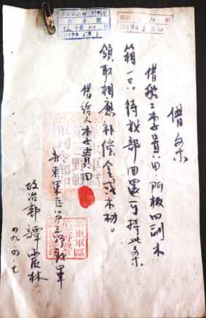 記者看到,那張譚震林親筆書寫的借條上記載了華東軍區(qū)第三野戰(zhàn)軍向普通船工李貴田借用門板四副、木箱一只的史實(shí),并特別注明,待軍隊(duì)回還,李貴田可領(lǐng)取相應(yīng)補(bǔ)償金或木材。