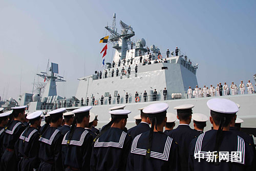 中國海軍副政委鄔華揚(yáng)、廣州軍區(qū)副司令兼南海艦隊司顧文根等和數(shù)百名海軍官兵專程到碼頭迎接“深圳”艦凱旋。