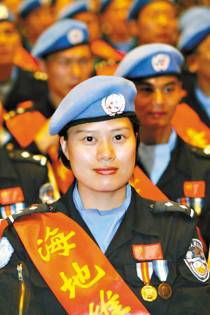 在這支防暴隊(duì)中,有7名女維和隊(duì)員受到了特別的關(guān)注,她們之中,有機(jī)關(guān)領(lǐng)導(dǎo),也有基層檢查員,還有醫(yī)生、護(hù)士;有的已結(jié)婚、有的已有了孩子,擁有幸福美滿的家庭,有的則剛剛走出大學(xué)校門。 第二次參加維和,被隊(duì)員們親切地稱為“大姐姐”的防暴隊(duì)首席聯(lián)絡(luò)官段中慧,總是那么和藹可親;被稱為“超女”的湯筱晶,不僅活躍于各種唱歌和拉歌場(chǎng)合,更是以腿長(zhǎng)善跑而令不少男同胞們感到汗顏;有率真活潑“小女孩”張偉,是名副其實(shí)的神槍手;有傲視舞林的馬德芬,作為一名土家族姑娘,她優(yōu)美的舞姿和別具特色的民族舞蹈給全體隊(duì)員留下了深刻的印象;有白衣天使朝鮮族大姐孫花玉;有見人就說(shuō)“笨豬(法語(yǔ)bonjour,你好!)”的戴紅,還有勇敢堅(jiān)強(qiáng)被親昵地稱為“小黑妹”的黃凌怡。