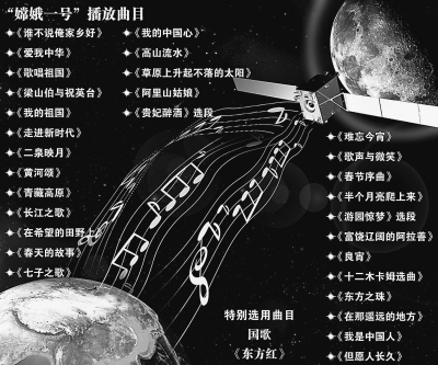 2006年7月7日,國防科工委宣布,要從數(shù)量龐大的中國樂曲中征集、遴選出30首優(yōu)秀樂曲,隨嫦娥一號(hào)衛(wèi)星搭載升空,在衛(wèi)星距地球38萬公里的月球軌道上播放,并公布了150余首建議曲目。同年10月6日,國防科工委宣布,以公眾投票票數(shù)的多少?zèng)Q出了《誰不說俺家鄉(xiāng)好》、《愛我中華》、《歌唱祖國》等30首歌曲。而我國的國歌《義勇軍進(jìn)行曲》和由我國第一顆人造地球衛(wèi)星“東方紅一號(hào)”在太空奏響的樂曲《東方紅》因其特殊的地位,將另行安排在嫦娥一號(hào)衛(wèi)星上搭載播放。