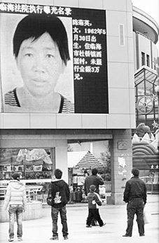 今天(注:1月15日)下午,記者在浙江臺州臨海市崇和門廣場100余平方米的大屏幕上看到,該市法院正把欠債不還的老賴的彩色照片以及家庭住址、職業(yè)和未履行債務(wù)情況等,通過大屏幕進行公開循環(huán)播放。