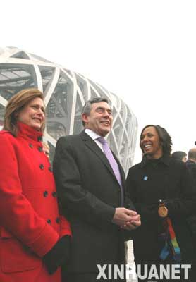 正在中國(guó)訪問的英國(guó)首相布朗19日上午參觀了“鳥巢”。陪同布朗參觀的有他的夫人薩拉·布朗和英國(guó)運(yùn)動(dòng)員、雅典奧運(yùn)會(huì)冠軍凱利·霍爾姆斯等訪華隨行人員。