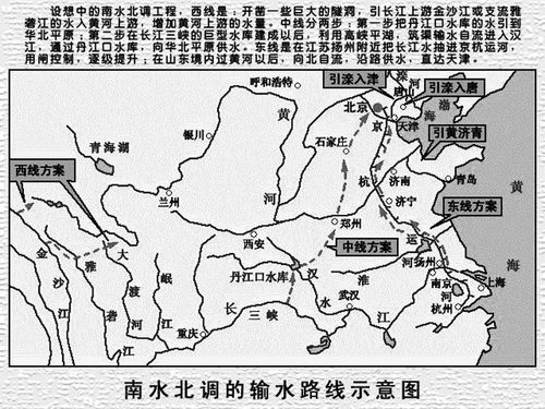 南水北調(diào)工程輸水示意圖。西線:開(kāi)鑿一些巨大的隧洞,引長(zhǎng)江上游金沙江或支流雅礱江的水入黃河上游,增加黃河上游的水量。中線分兩步:第一步把丹江口水庫(kù)的水引到華北平原;第二步在長(zhǎng)江三峽的巨型水庫(kù)建成以后,利用高峽平湖,筑渠輸水自流進(jìn)入漢江,通過(guò)丹江口水庫(kù),向華北平原供水。東線:在江蘇揚(yáng)州附近把長(zhǎng)江水抽進(jìn)京杭運(yùn)河,用閘控制,逐級(jí)提升;在山東境內(nèi)過(guò)黃河以后,向北自流,沿路供水,直達(dá)天津。