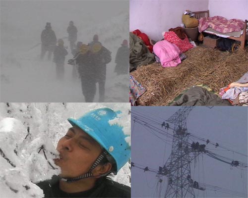 1月23日,在江西和湖北交界處三座相連的500千伏線塔幾乎同時(shí)倒塌,湖北省輸變電工程公司的搶修人員爬了三個(gè)小時(shí)陡峭的山路才趕到了海拔1000米的雪山上,鐵塔已經(jīng)被徹底摧毀,扭成一團(tuán),這是江西和華中電網(wǎng)相連的主要通道,威脅到江西全省的用電。