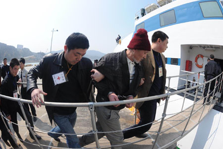 接下來的一切,是雙向遣返任務(wù)中的“常規(guī)動作”:確認王志華身份無誤后,臺灣執(zhí)法人員把他移交給大陸有關(guān)人員。頭戴帽子、胡子花白的王志華卸下了臺灣的手銬腳鐐,換上了大陸的手銬,在一前一后兩個佩戴紅十字會證件的工作人員押帶下登上扶梯進入“海峽”號。