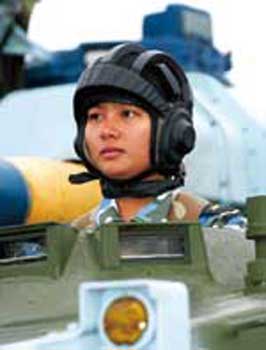 2007年1 月,裝甲戰(zhàn)車駕駛考核在一個(gè)復(fù)雜山地如期舉行。文敏是參加考核的惟一女隊(duì)員。