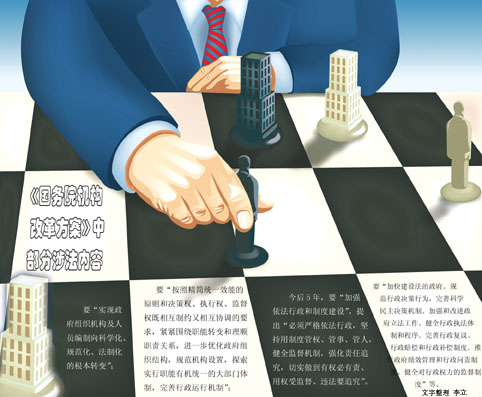 比如,要“實現(xiàn)政府組織機構及人員編制向科學化、規(guī)范化、法制化的根本轉變”;要“按照精簡統(tǒng)一效能的原則和決策權、執(zhí)行權、監(jiān)督權既相互制約又相互協(xié)調的要求,緊緊圍繞職能轉變和理順職責關系,進一步優(yōu)化政府組織結構,規(guī)范機構設置,探索實行職能有機統(tǒng)一的大部門體制,完善行政運行機制”……