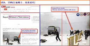 其一是“以偏概全,混淆視聽(tīng)”。3月17日,CNN和法新社在各自網(wǎng)站上使用了同一張圖片,圖中兩輛綠色卡車(chē)一前一后正向兩名平民駛來(lái)——事實(shí)上,如果完整展示圖片的話(huà),可以看到當(dāng)時(shí)軍車(chē)旁有約10名暴徒在向軍車(chē)投擲石塊,雖然CNN網(wǎng)站的圖片說(shuō)明寫(xiě)的是“藏人向軍車(chē)投擲石塊”,但圖中卻看不見(jiàn)這一已被裁去的場(chǎng)景。
