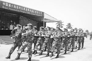 今天(26日)上午10時整,在地中海畔中國工兵營舉行的授勛儀式上,聯(lián)合國授予了中國第三批赴黎巴嫩維和部隊343名官兵“和平勛章”。