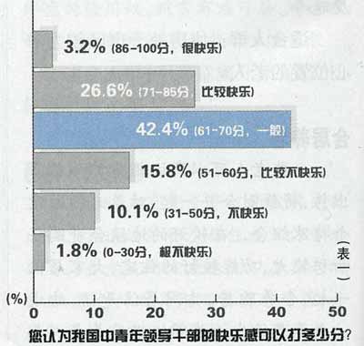 在回答“請(qǐng)分析一下您的心靈深處,怎樣才能使您獲得真正的快樂(lè)?”一題時(shí),有58.3%的人選擇了“內(nèi)心的一種從容與安寧感”,15.6%的人選擇了“個(gè)人素質(zhì)能力的不斷提升”,12.3%的人選擇了“衣食無(wú)憂,家庭幸!保12%的人選擇了“職務(wù)與期望值相匹配”,而選擇“發(fā)財(cái)致富,盡情享樂(lè)”的僅為1.1%。