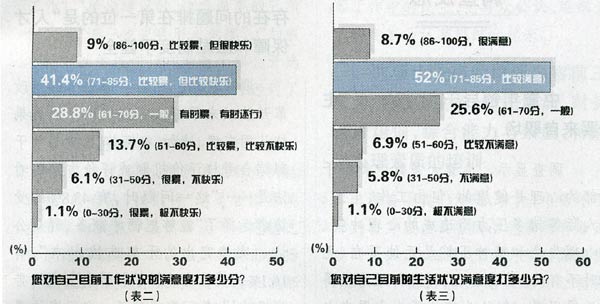 調(diào)查顯示,盡管大多數(shù)中青年干部的心理是健康的,但由工作、生活、人際等諸多壓力而造成的心理沖突、心理失衡和精神壓抑是無(wú)處不在、無(wú)時(shí)不有的。受訪(fǎng)者在回答“如果您覺(jué)得活得很累,您認(rèn)為您的壓力主要來(lái)自哪些方面?”這一問(wèn)題時(shí),選擇最多的前三項(xiàng)分別是“工作責(zé)任心太強(qiáng),追求完美之累”,“工作負(fù)荷重,疲于奔命之累”,“迎合領(lǐng)導(dǎo)出政績(jī),失去自我之累”,選擇比例分別達(dá)到了51.3%,34.7%和29.2%,而選擇“交際太繁,苦于應(yīng)酬之累”,“前程靠人恩賜,職場(chǎng)非正常競(jìng)爭(zhēng)之累”的各占20.3%,并列排在第四位,最后依次是“家庭負(fù)擔(dān)重,子女入學(xué)就業(yè)之累”,占12.9%,“與同事、朋友比心理不平衡之累”,占5.9%,以及“多種壓力”等,占2.6%。