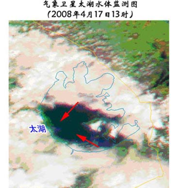 中新網(wǎng)4月18日電 據(jù)問天網(wǎng)消息,在氣象衛(wèi)星2008年 4月17日13時47分(北京時)太湖藍(lán)藻監(jiān)測圖中(附圖),太湖的北部和東部被云覆蓋,西南部分地區(qū)為晴空。晴空部分水域中顯現(xiàn)出藍(lán)藻水華信息(附圖箭頭所指暗綠色區(qū)域),影響范圍面積約250平方公里。