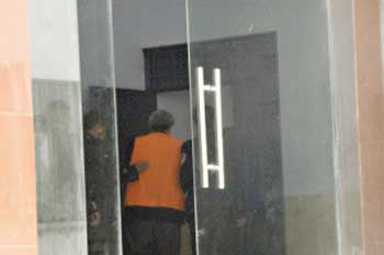 本報(bào)河南南陽訊 (特派記者李穎、廖杰華攝影報(bào)道)昨日上午9時(shí)30分,吳天喜涉嫌強(qiáng)奸、領(lǐng)導(dǎo)黑社會(huì)性質(zhì)組織案二審開庭,河南省高級(jí)人民法院在南陽內(nèi)鄉(xiāng)縣法院開庭審理此案。快9時(shí),記者跟隨吳天喜和其余被告到了法庭外。吳天喜被單獨(dú)安排在一個(gè)房間內(nèi)看守,在等待開審的時(shí)間內(nèi),吳天喜幾乎一動(dòng)不動(dòng)地坐著。進(jìn)法庭的時(shí)候,他抬頭看了一眼外面等待的親屬,挪進(jìn)法庭。