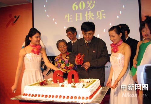 陳毅之子、中國(guó)對(duì)外友好協(xié)會(huì)會(huì)長(zhǎng)陳昊蘇(中)重回母校,為“紅色幼兒園”切六十華誕生日蛋糕。