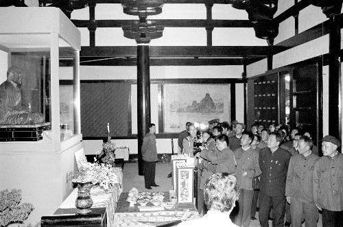 建于公元1688年的御影堂內(nèi),供奉著鑒真乾漆夾造的坐像,高2尺7寸,面向西方,雙手拱合,結(jié)跏跌坐,團(tuán)目含笑,兩唇緊斂,表現(xiàn)鑒真于公元763年圓寂時(shí)的姿態(tài),已被定為日本國寶,每年只開放3天供人瞻仰。日本著名畫家東山魁夷為御影堂繪制的68幅屏障壁畫,有《云影》、《濤聲》、《黃山曉云》、《揚(yáng)州薰風(fēng)》、《桂林月宵》和《瑞光》等。