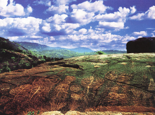 第一組巖畫在山坡西側(cè),南北長4米、東西寬2.8米,以人物和農(nóng)作物圖案為主。在人面與農(nóng)作物之間,還有鳥頭、鳥面、圓點、刻劃符號等。第二組在山坡南側(cè),南北長8米,東西寬6米,以星象、鳥獸圖案為主。第三組在山坡頂部,由人面像和各種符號組成。另外,在山坡頂部還有一大三小四塊大石頭,其中一塊上有許多人工鑿磨而成的圓窩,直徑在3——7厘米之間。(資料來源:連云港市政府網(wǎng)站)