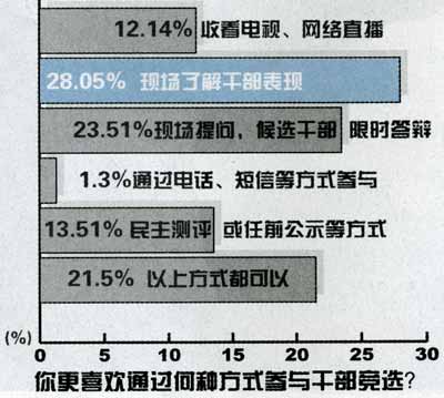 “如果條件許可,你更喜歡通過何種方式了解和參與干部競選?”調(diào)查結(jié)果顯示,“到演講答辯現(xiàn)場,全面了解干部現(xiàn)場反應(yīng)”、“現(xiàn)場提問,并要求候選干部限時(shí)答辯”排在了前兩位,占受調(diào)查者的51.56%。此后是“任前公示或民主測評等方式”和“收看電視、網(wǎng)絡(luò)直播”,最不愿意采用的方式是電話或短信方式。也有部分受調(diào)查者表示以上形式都可以。記者隨機(jī)采訪的部分市民紛紛表示:“如果條件許可,我們愿意到現(xiàn)場!