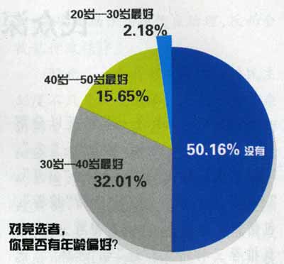 年齡偏好。就年齡而言。50.16%的受調(diào)查者表示對受調(diào)查者沒有年齡偏好。但在對競選者進(jìn)行年齡段劃分,20歲至50歲每十歲為一個(gè)年齡段時(shí),顯示出相對而言群眾更加看好30到40歲的參選者。“山東驚現(xiàn)‘80后’廳官!”“史上最牛公務(wù)員!”近日,共青團(tuán)山東省委副書記,現(xiàn)年28歲的張輝成了網(wǎng)絡(luò)紅人,引起社會廣泛關(guān)注。實(shí)際上,如果單就年齡而言,這并非稀罕事。河北省代省長胡春華是中國最年輕的省長,其仕途路上一直都是最年輕干部,27歲任副廳,29歲當(dāng)正廳。據(jù)相關(guān)披露,若非因太年輕,24歲就是副廳。 (執(zhí)筆:人民論壇記者 艾 蕓)