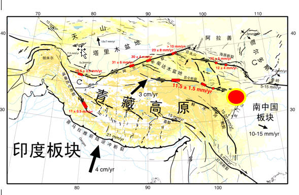 印度板塊向亞洲板塊俯沖,造成青藏高原快速隆升。高原物質(zhì)向東緩慢流動(dòng),在高原東緣沿龍門山構(gòu)造帶向東擠壓,遇到四川盆地之下剛性地塊的頑強(qiáng)阻擋,造成構(gòu)造應(yīng)力能量的長期積累,最終在龍門山北川-映秀地區(qū)突然釋放。