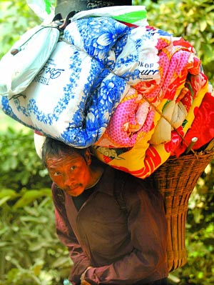 昨日,一名災民背著搶救出來的家什,從南壩撤離。