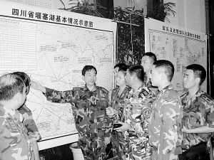 抬頭看,大屏幕上實時顯示著災(zāi)區(qū)各地的實況畫面,大大小小的兵力部署圖上面,插滿了表示兵力部署的小旗。