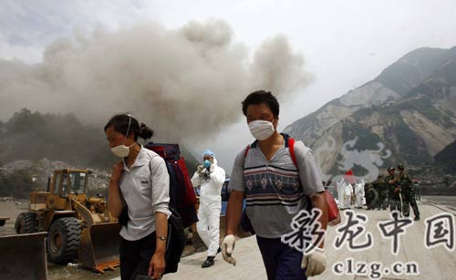 居民離開映秀鎮(zhèn),背后升起爆破拆除房屋而產(chǎn)生的濃煙。記者 韓億國攝 (來源:彩龍中國)
