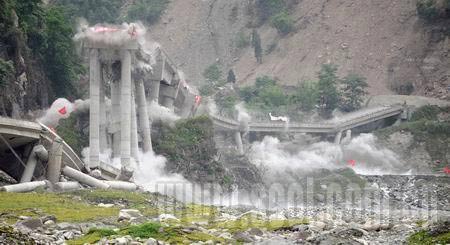 隨著“轟”的一聲巨響,被地震震毀的百花大橋殘余橋體轟然倒下。(來源:四川在線)