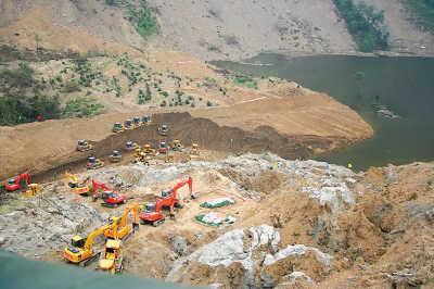 31日晚8時(shí),記者在唐家山堰塞體一側(cè)的山坡上看到,一條土黃色的溝渠圍繞著堰塞體的左側(cè),除了靠近堰塞湖處的泄流槽仍有兩臺(tái)挖掘機(jī)和兩臺(tái)推土機(jī)在施工外,現(xiàn)場(chǎng)其他的機(jī)械都已停工,并統(tǒng)一停放在一處高地上。