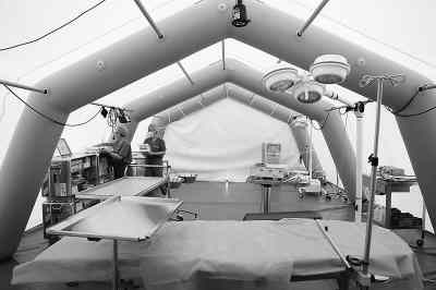 醫(yī)院設(shè)立了門(mén)診、內(nèi)科、外科、婦科、兒科和藥房,還有放射科、檢驗(yàn)科、病房以及重癥監(jiān)護(hù)室,可謂“麻雀雖小,五臟俱全”。我們來(lái)到作為手術(shù)室的帳篷前,這頂帳篷不僅大而且顯得安全、結(jié)實(shí),帳篷用充氣管支撐起來(lái),里面有散熱的空調(diào)設(shè)備。據(jù)介紹,野戰(zhàn)醫(yī)院每頂帳篷都由天然材料制成,防火、無(wú)污染,還有真空隔熱層。配備的制氧機(jī)可直接將空氣變成氧氣,并可以調(diào)節(jié)氧氣濃度,從而代替了笨重的氧氣瓶。帳篷里面,整齊的擺放著手術(shù)服和拖鞋,一個(gè)洗手池已經(jīng)固定好。27日,這里就做了一臺(tái)簡(jiǎn)單的手術(shù)。