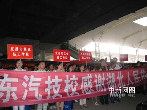 “我們都是你親人”、“熱列歡迎新同學(xué)”、“鄂川人民心連心”,7日的武昌火車站一號站臺,前來迎接這批學(xué)生的湖北技工院校師生高舉溫情的標(biāo)語。每個學(xué)校還專門安排了迎接接收學(xué)生的校車,并整齊地停在站臺上。當(dāng)四川技校生一踏上車站,即刻被站臺上熱情的人們所包圍。來自湖北各地的技工院校,將災(zāi)區(qū)學(xué)生分別有秩序地帶領(lǐng)到各自對口接收學(xué)校的校牌下集中,排成整齊的隊伍,并點名清點人數(shù)。