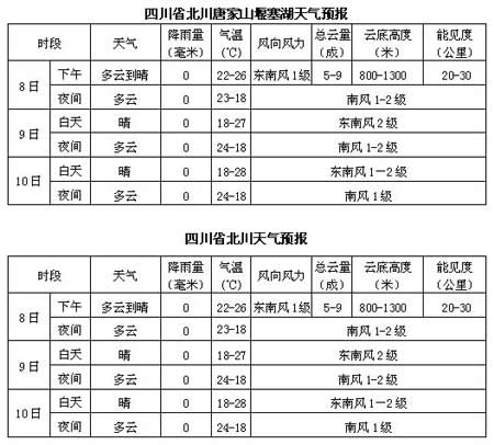 天氣預報:預計8至13日,地震災區(qū)主要以多云或晴為主,有時有小陣雨,氣溫較高,濕度較大,其中,四川成都、綿陽、德陽、廣元以及甘肅文縣、陜西略陽、寧強等地日最高氣溫可達27~32℃,帳篷內溫度34~40 ℃,四川汶川、茂縣、理縣日最高氣溫可達24~27℃,帳篷內溫度28~33℃。注意采取防暑降溫措施。