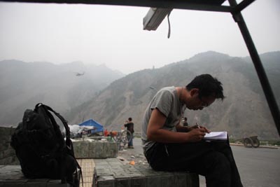 中新社記者宋方燦在重災區(qū)映秀寫稿