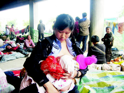 地震發(fā)生后,被轉(zhuǎn)移來的嬰兒除了可以喝一點(diǎn)水和稀飯外,沒有其他東西可吃!按笕诉可以餓、還可以忍,而這些小嬰兒卻不能餓、不能忍!作為母親,我覺得這些孩子太可憐了。正好我還在哺乳期,就讓我來給他們喂奶吧!”在受災(zāi)群眾安置點(diǎn)協(xié)助工作的29歲民警蔣曉娟提出:我去給這些嬰兒哺乳!