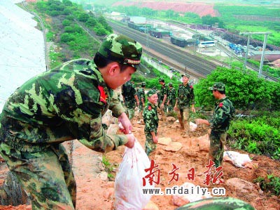 前日18時,京廣鐵路清遠(yuǎn)龍?zhí)炼伟l(fā)生6處山體滑坡,直接威脅京廣交通大動脈的安全,廣東省清遠(yuǎn)軍分區(qū)立即組織清城區(qū)民兵應(yīng)急分隊400多人連夜趕往搶險。